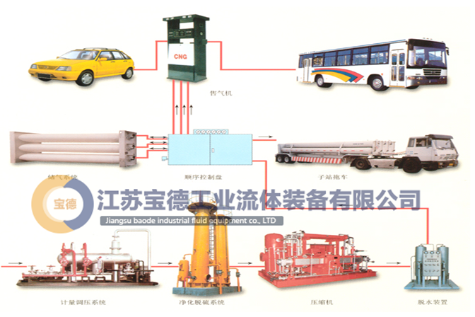 CNG加氣站的主要工藝流程如下圖所示:從天然氣管網進氣,經計量調壓裝置后進入凈化脫硫系統,再進入壓縮機組,壓縮到25MPa,然后經過高壓脫水裝置進行處理。此時可直接將壓縮天然氣注入車載氣瓶給汽車加氣,或注入CNG拖車的氣瓶運往子站,這稱為慢速加氣,另外,也可將壓縮天然氣儲存在儲氣瓶組內,通過順序控制盤再向汽車加氣,這稱為快速加氣。